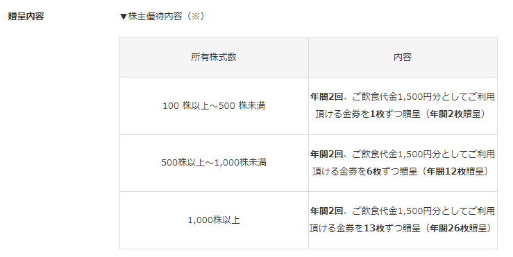 - 100株以上500株未満の保有で、飲食代金1,500円分として利用できる金券1枚(年間2枚贈呈)