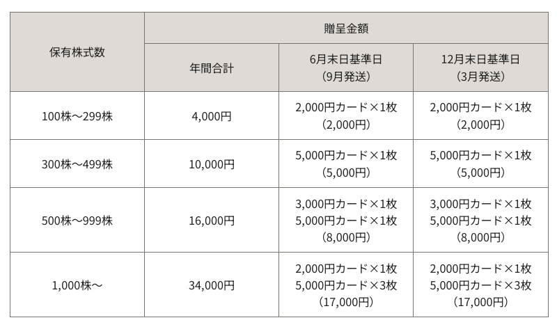 100株以上299株の保有で2,000円カード1枚(年2回で年間4,000円相当)