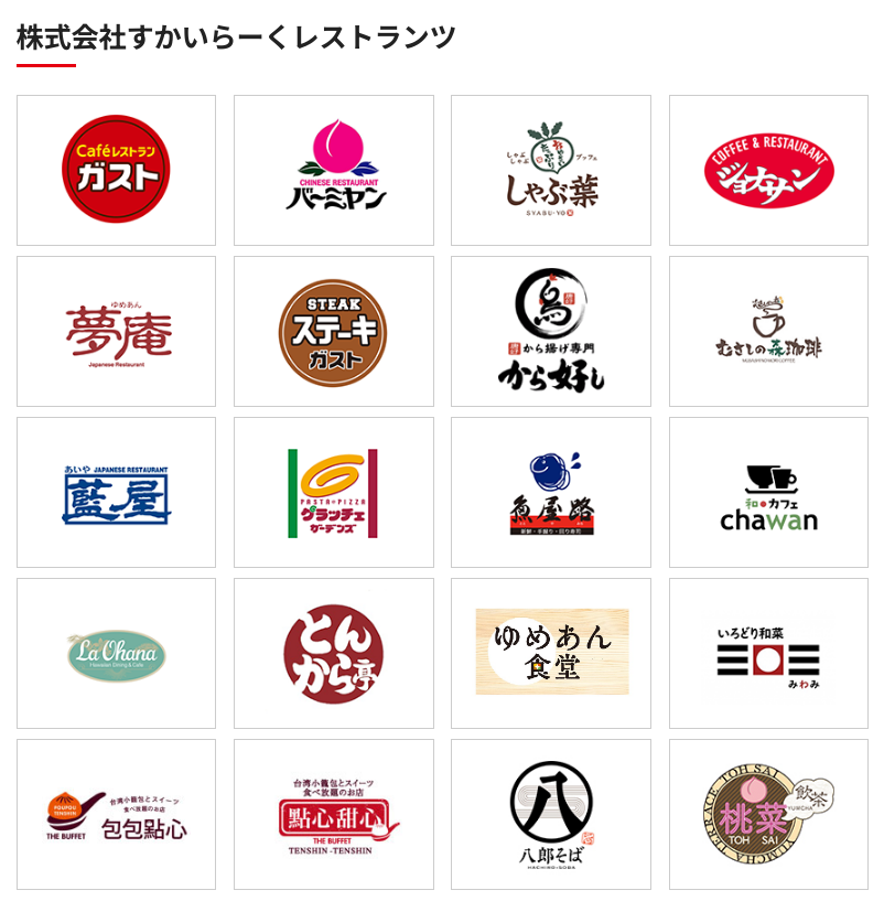 こちらのカードは、株式会社すかいらーくレストランツが運営するガストやバーミヤン、しゃぶ葉、ジョナサンなど、様々な店舗で利用可能となっております。