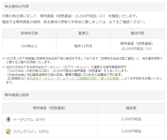 優待内容は、暗号資産(仮想通貨)10,000円相当を贈呈となっております。