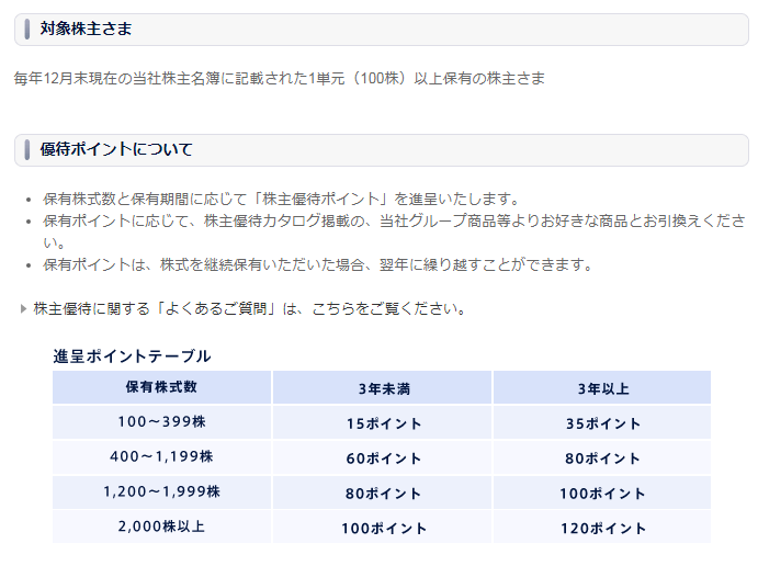 上記のように保有株式数と保有期間に応じて株主優待ポイントがもらえます。