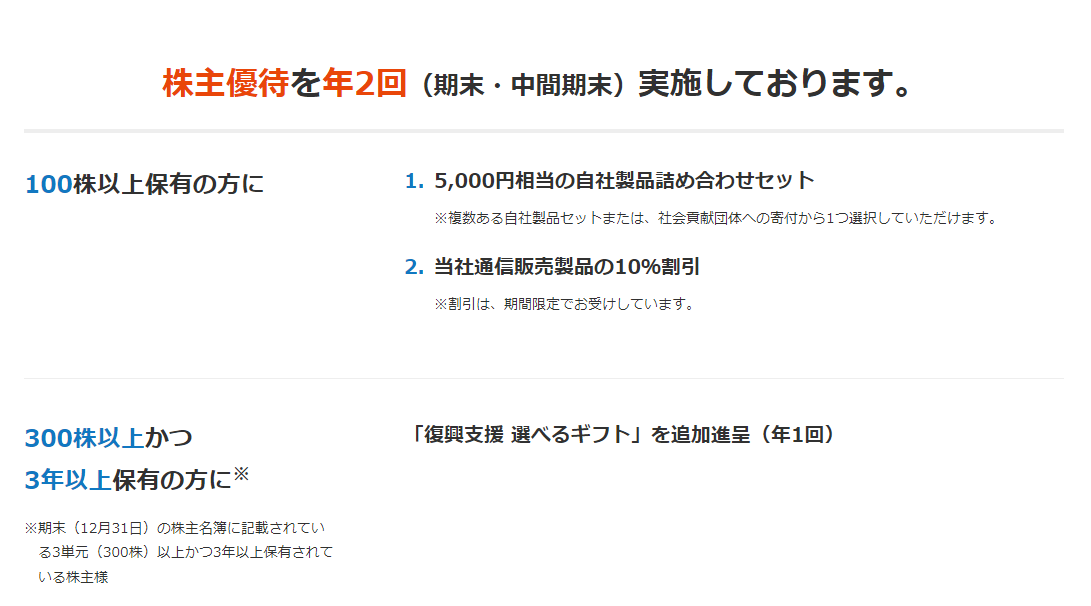 こちらは300株以上かつ3年以上保有している株主が対象となっており、先ほどの優待品に加え、「復興支援 選べるギフト」を年1回追加進呈となっております。