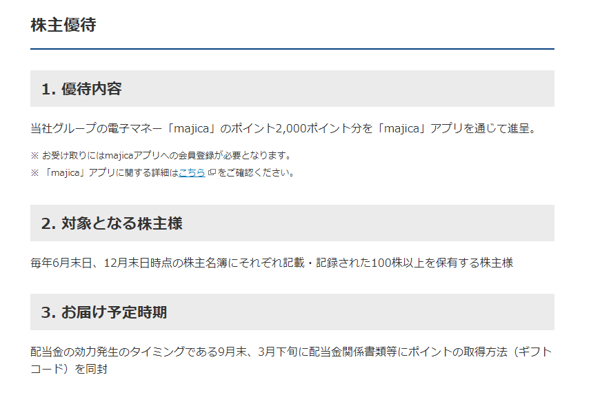 優待内容は、100株以上保有する株主を対象に、同社グループの電子マネー「majica」のポイント2,000ポイント分となっております。