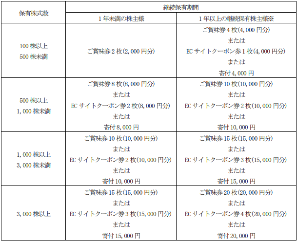 1年以上保有:ご賞味券10枚(10,000円分)、またはECサイトクーポン券2枚(10,000 円分)、または寄付10,000円 - 1,000株以上3,000株未満の場合