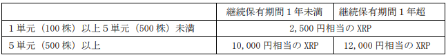 500株以上保有の場合、継続保有での優遇もあり、1年を超えての継続保有になると、暗号資産XRP12,000円相当にアップします。