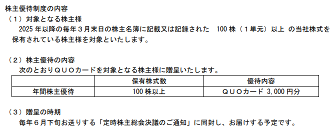 優待内容は、100株以上の株式を保有している株主を対象に、QUOカード3,000円分となっております。