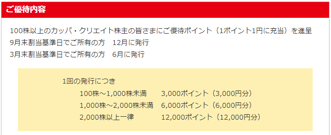 カッパ・クリエイトの株主優待は、毎年3月と9月の年2回が権利確定月となります。