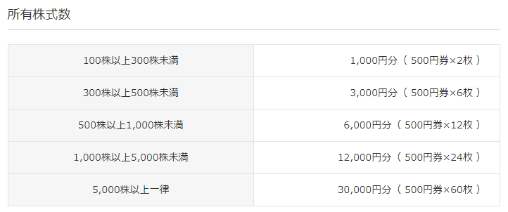 - 300株以上500株未満の保有で3,000円分(500円券×6枚)