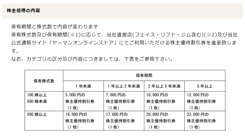 優待内容は、保有株式数及び保有期間に応じて、同社公式通販サイト「ヤーマンオンラインストア」などで利用できる株主優待割引券を進呈となっております。