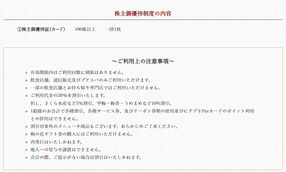 梅の花グループをよく利用される方にはおすすめの優待です。