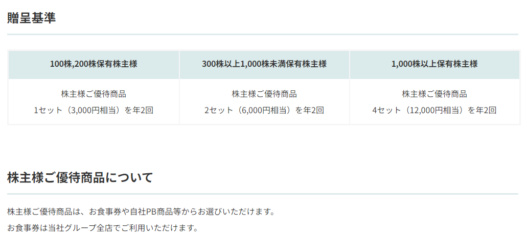 優待内容は、同社グループ店舗で利用できる「株主様ご優待カード」を贈呈となっております
