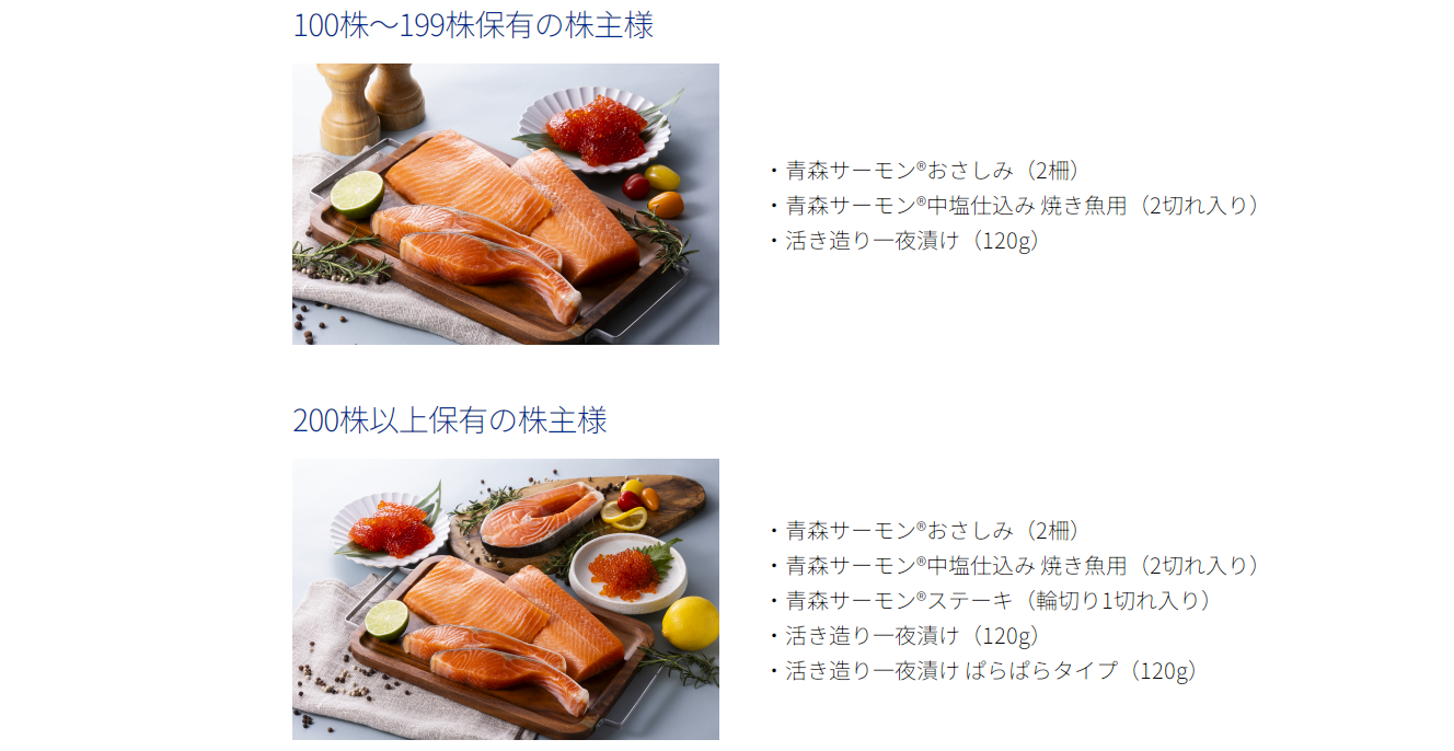 - 100株以上199株の保有で、自社で養殖あるいは加工した食品5,000円相当