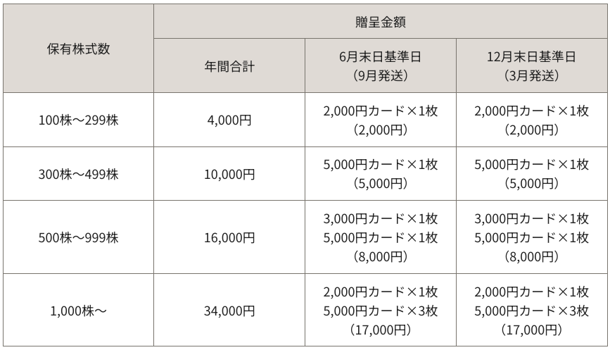 100株保有の場合、6月と12月の年二回で年間4,000円分の優待カードがもらえます。