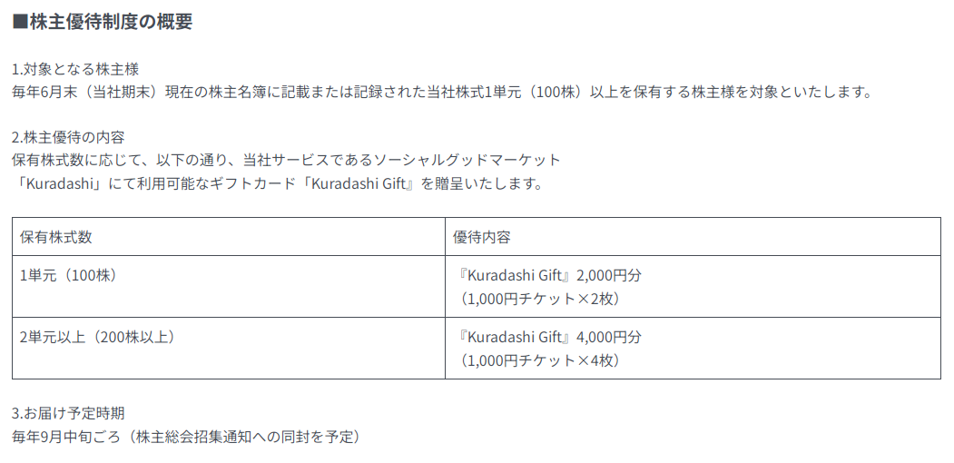優待内容は、同社サービスであるソーシャルグッドマーケット「Kuradashi」にて利用可能なギフトカード「Kuradashi Gift』を贈呈となっています。