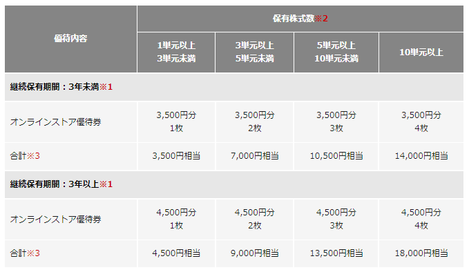 優待券の内容は、保有株式数と継続保有期間に応じたものになります。