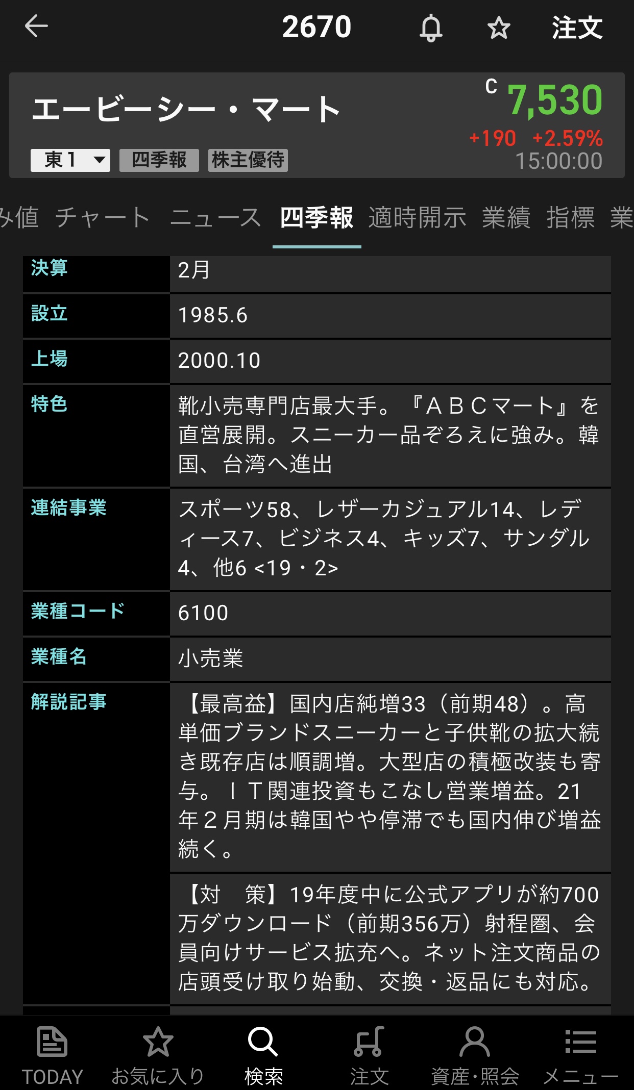 月次開示 材料 エービーシー・マート|2020年2月期12月度概況について Facebook postはてブLINEPocketFeedly 概要 12月度概況 12月度は、年末商戦は堅調に推移したものの、土日祝日が2日少ない曜日並びであったことから全店で前期比2.4%のマイナス、既存店で4.0%のマイナスとなりました。 商品別では、気温が高めで降雪がなかったため、季節商品の販売が伸び悩みました。 スポーツシューズとアパレルの販売が堅調でした。 エービーシー・マート【2670】の情報 IR情報 2670-20200107 スポンサーリンク Facebook postはてブLINEPocketFeedly