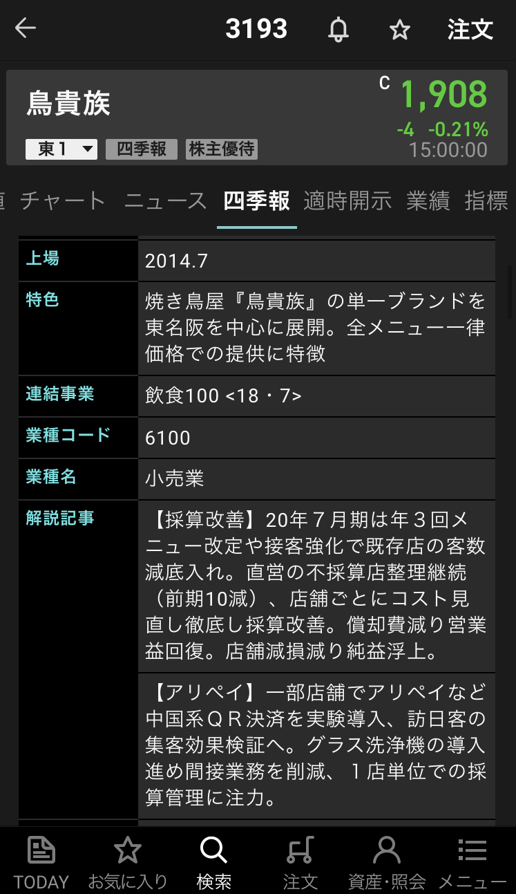 月次開示 材料 鳥貴族|月 次 報 告 ( 2 0 1 9 年 1 1 月 度 ) Facebook postはてブLINEPocketFeedly 概要 1.2020 年 7 月期 店舗数の状況 TCC店が新規出店により1店舗増加しました。 一方、業績不振の直営店を9店舗閉店し、11 月末の店舗数は651店舗となりました。 鳥貴族【3193】の情報 IR情報 3193-20191206 スポンサーリンク Facebook postはてブLINEPocketFeedly