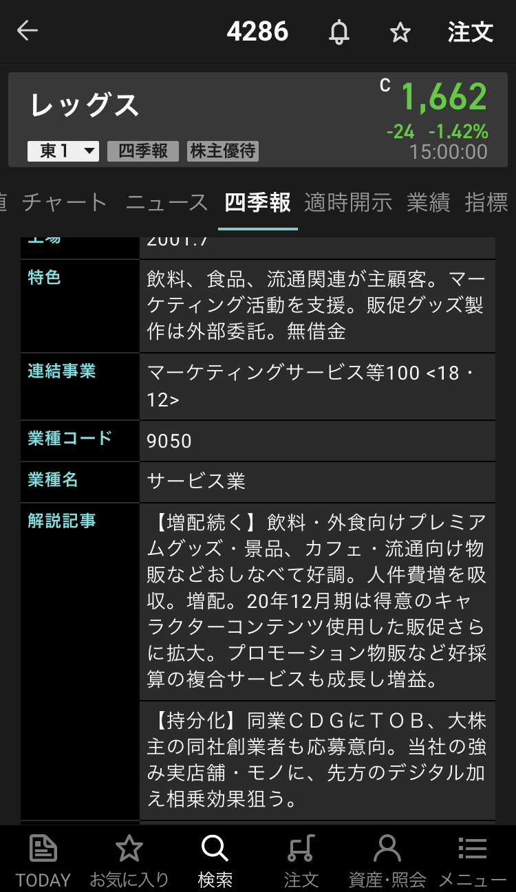 材料 特別利益 レッグス|投資有価証券売却益(特別利益)の計上に関するお知らせ Facebook postはてブLINEPocketFeedly 概要 株式会社レッグス(本社:東京都港区、代表取締役社長:内川淳一郎、東証第一部:コード番号4286、以下、当社)は、保有する投資有価証券の一部を売却したことにより、下記のとおり投資有価証券売却益が発生いたしましたので、お知らせいたします。 1.投資有価証券売却の理由 保有資産の効率化および財務体質の強化を図るため レッグス【4286】の情報 IR情報 4286-20191226 スポンサーリンク Facebook postはてブLINEPocketFeedly
