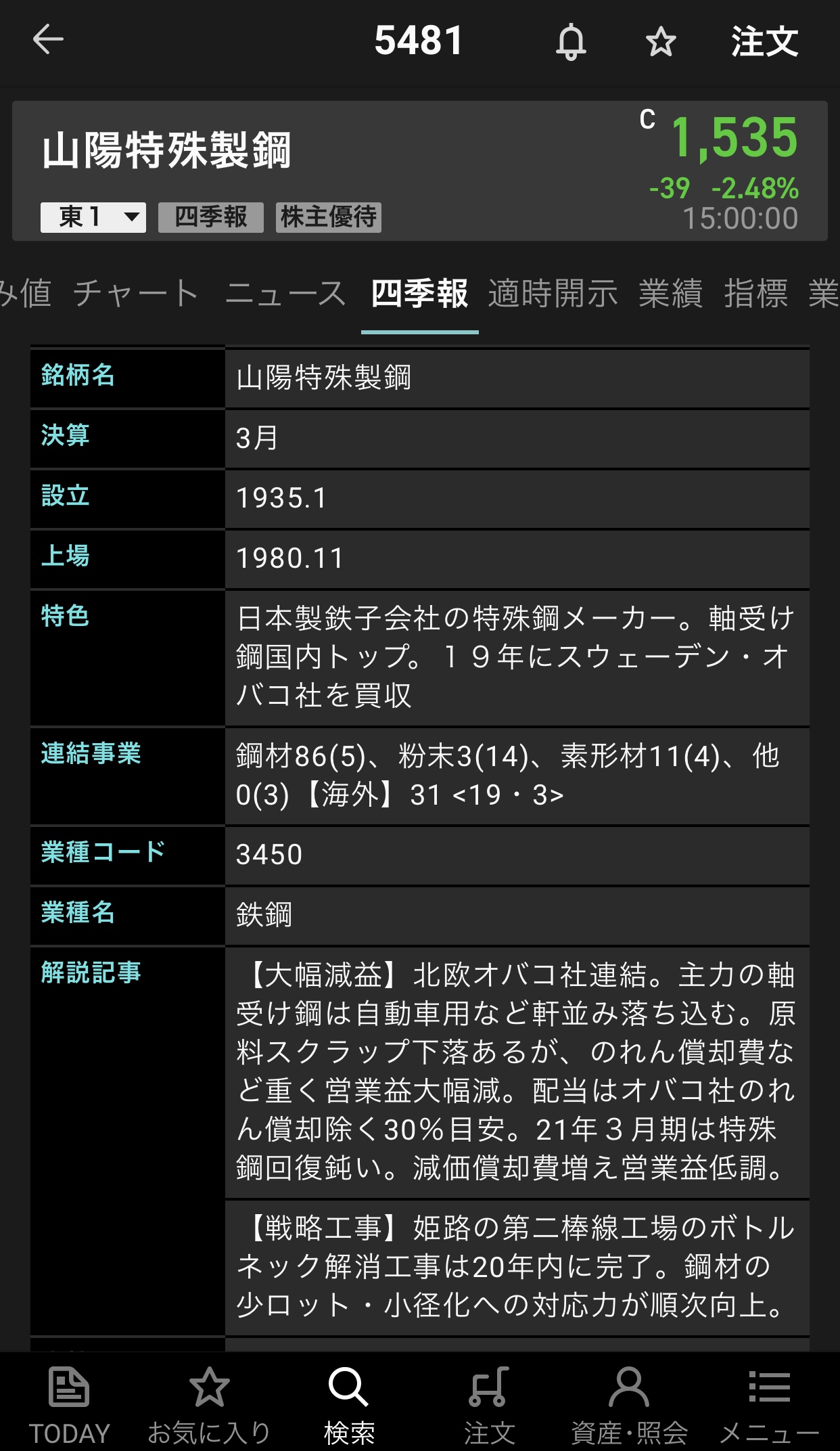 材料 自己株式の消却 山陽特殊製鋼|自己株式の消却に関するお知らせ Facebook postはてブLINEPocketFeedly 概要 当社は、本日開催の取締役会において、会社法第 178 条の規定に基づき、下記のとおり自己株式を消却することを決議いたしましたので、お知らせいたします。なお、今回の消却株式数は、当社が 2019 年 6 月 20 日から 2019 年 12 月 3 日までに市場買付けによって取得した自己株式および過去から保有している自己株式の一部を合計した株式数であります。 山陽特殊製鋼【5481】の情報 IR情報 5481-20191225 スポンサーリンク Facebook postはてブLINEPocketFeedly