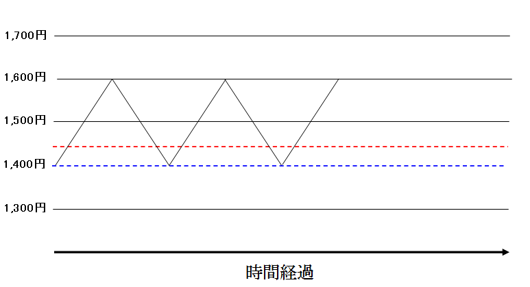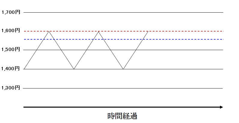 上記チャートを例に出すと一番いいのは1,400円で買って1,600円で売ることですが、最安値・最高値で売買するのはかなり難しいです。