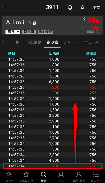 楽天証券のモバイルトレーディングツール「iSPEED」の場合、以下のように歩み値が表示されています。