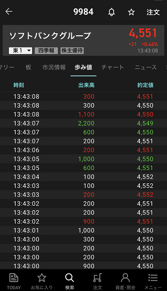 ソフトバンクグループの場合は、秒単位で何度も取引されているのがわかります。