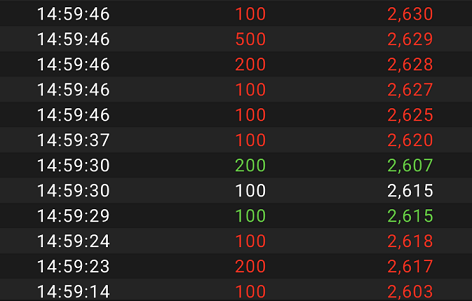 歩み値が緑色の場合は、その約定値が前回の約定値よりも低いことを意味しています(ダウンティック)。