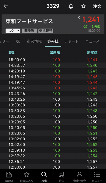 次に【3329】東和フードサービスの歩み値を確認していきましょう。
