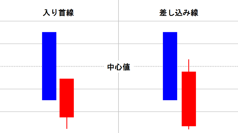 入り首線と差し込み線は、大陰線より安く始まってその後上昇に転じたところは同じです。