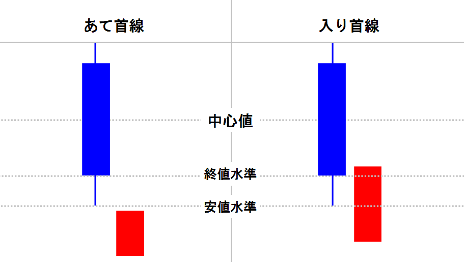 入り首線は、大陰線の次のローソク足が大陰線よりも安く始まり、その後は上昇に転じて大陰線の終値水準までは到達するものの、大陰線の中心値には届かなかった形です。