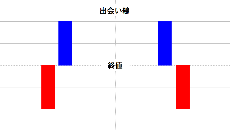 出会い線とは、「陽線と陰線」または「陰線と陽線」の組み合わせで、2本目のローソク足が窓開けして始まったものの、結局は1本目の終値と同じ水準で引けた形のことをいいます。