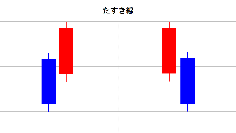 たすき線とは、陰線から陽線、または陽線から陰線の組み合わせで、2つのローソク足の一部が重なった形の組み合わせのことをいいます。