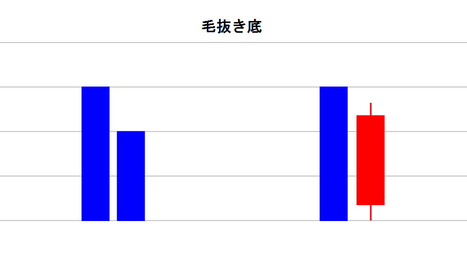 毛抜き底は、2日連続(日足の場合)で同じ安値をつけていますが、それより下に進めていません。