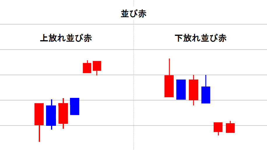 上に窓を開けて並び赤が出現した場合は「上放れ並び赤」、下に窓を開けて並び赤が出現した場合は「下放れ並び赤」といいます。
