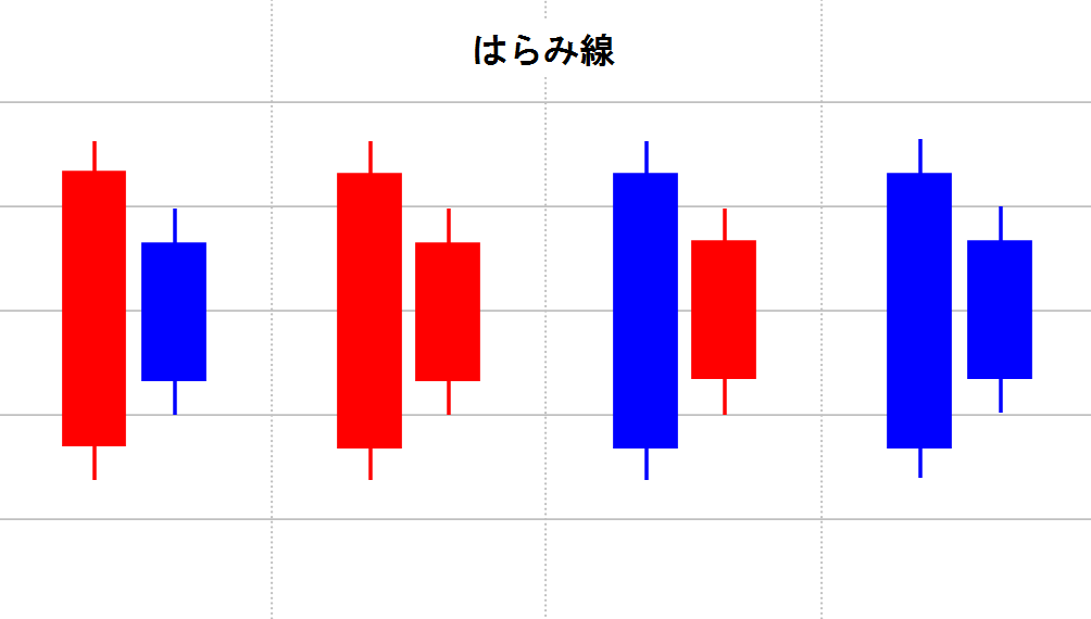 はらみ線とは、1本目のローソク足の実体に、2本目のローソク足が収まる形の組み合わせをいいます。