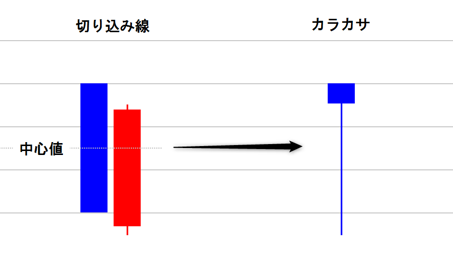 切り込み線とは、大陰線の次のローソク足が、大陰線よりも安く始まったものの、その後は上昇に転じて大陰線の中心値を上回って取引を終えた形のことです。