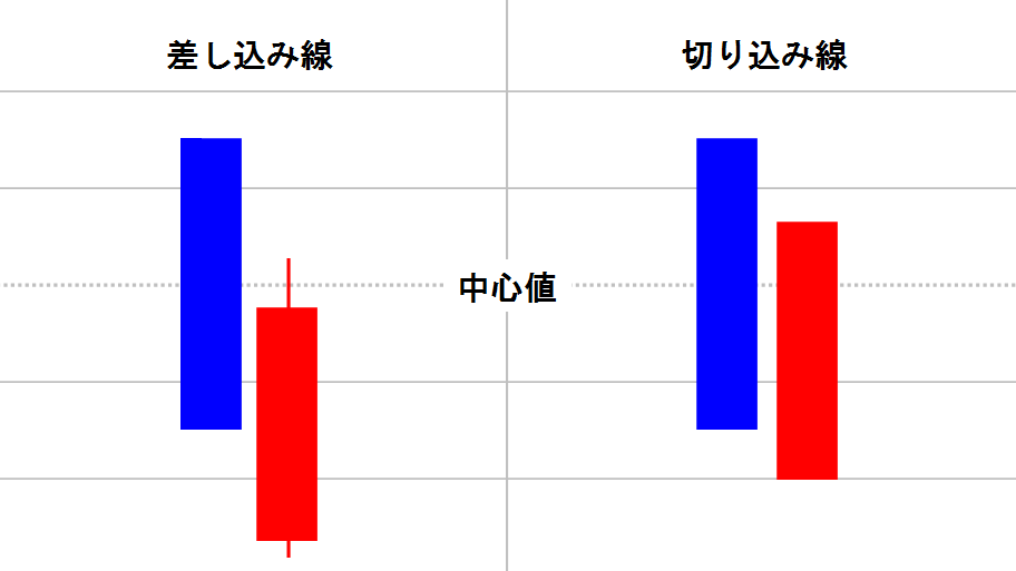 差し込み線は、大陰線の次のローソク足が、大陰線よりも安く始まったものの、その後は上昇に転じて大陰線の「中心値から終値」の範囲で取引を終えた形です。