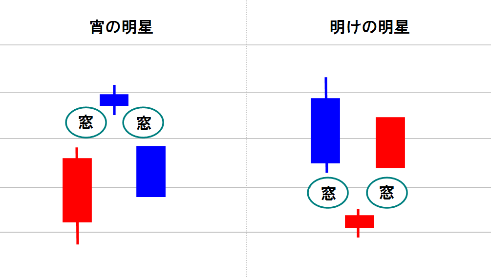 宵の明星と明けの明星は、星の前後で違う方向に窓開けしている形のことです。
