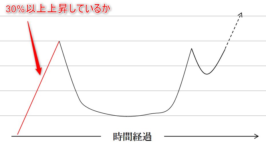 この時に注目すべき点として「カップ形成の前に株価が30%以上上昇したかどうか」というものがあります。