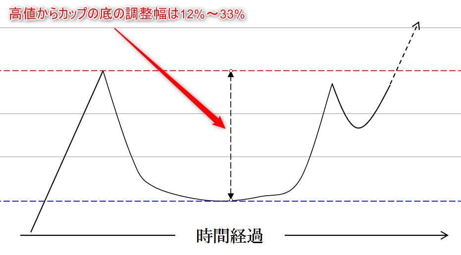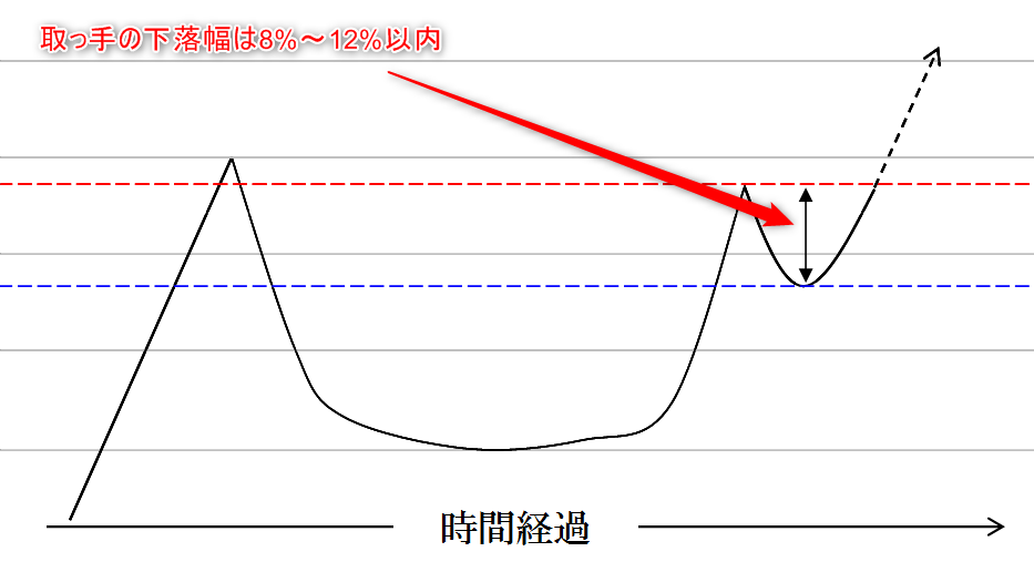 取っ手の下落幅は「8%~12%以内」が良いとされており、この範囲なら強気相場とされています。