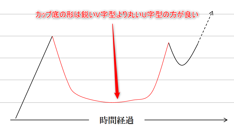 U字型の場合、カップ底付近で複数回の小さな下落があったことがわかります。