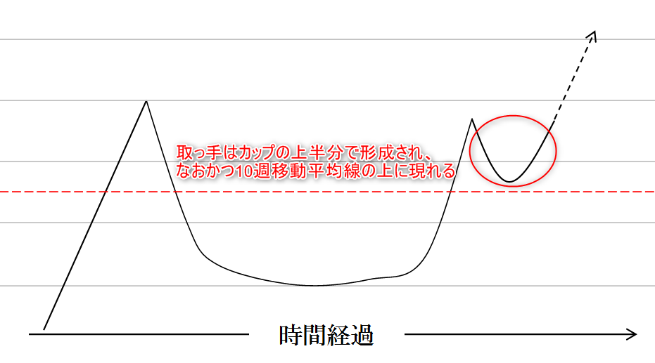 取っ手はカップの上半分で形成され、なおかつ10週移動平均線の上に現れる