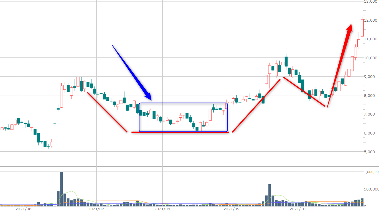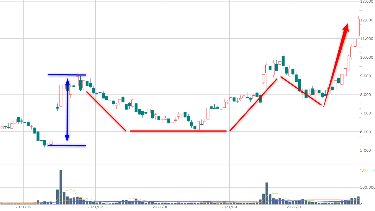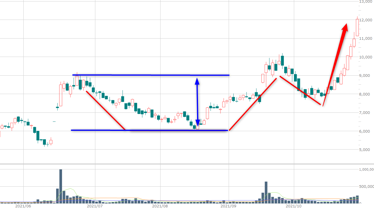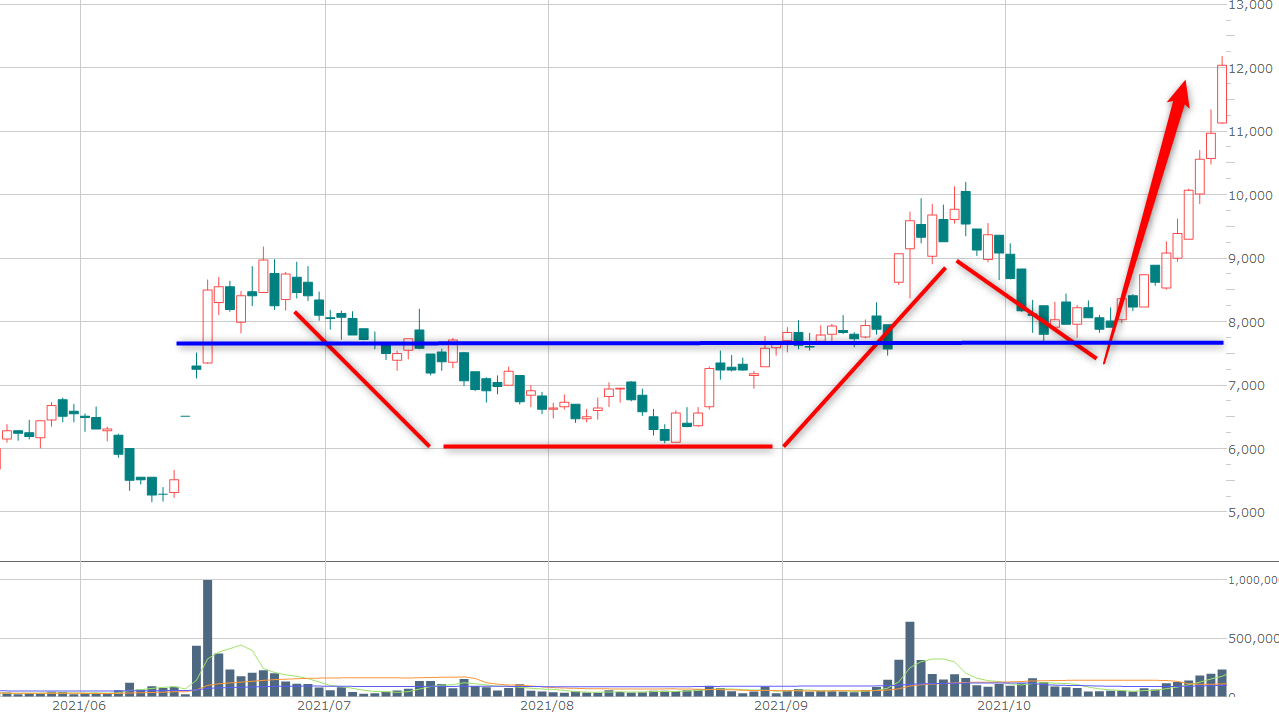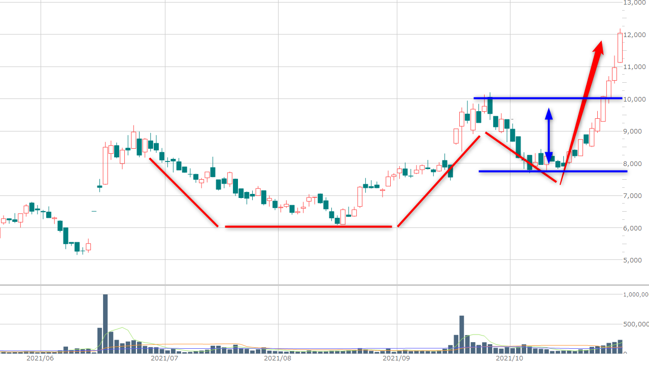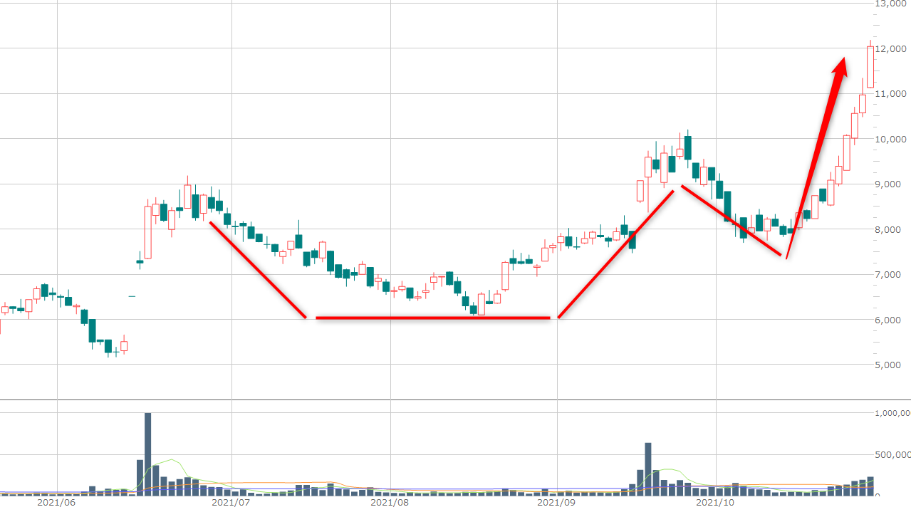 このポイントを上抜けると出来高が急増し、株価上昇が加速していくとされています。