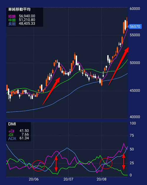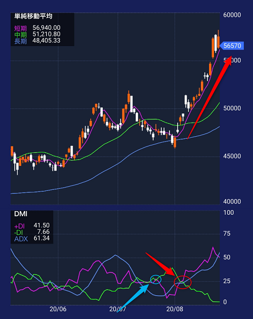 上記チャートでもゴールデンクロス後に株価は上昇し、上昇すればするほど「+DI」と「-DI」の幅が大きくなっているのがわかると思います。