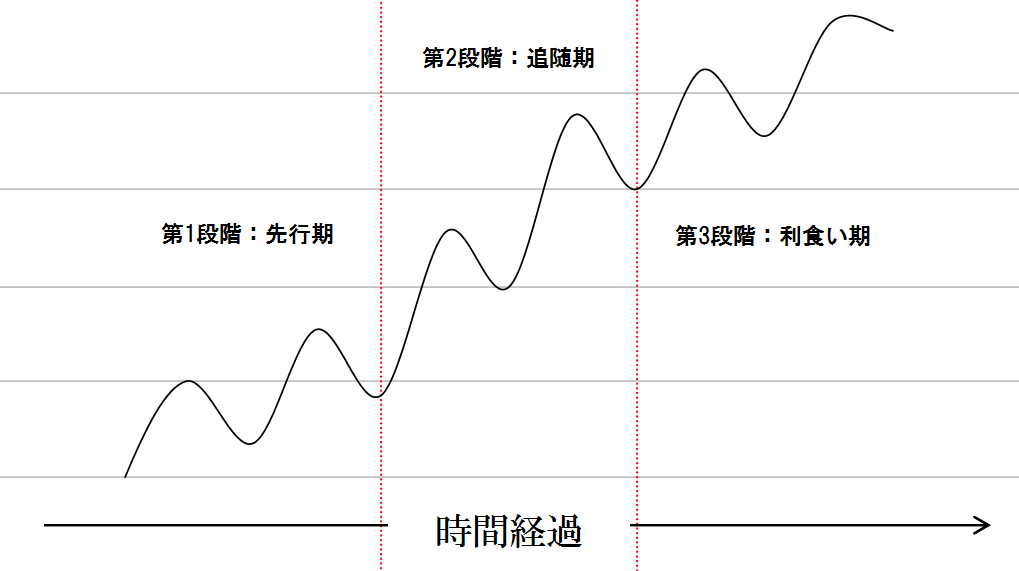 第2段階の追随期は、先行期の動きを察知した一般投資家などが参入し始める時期です。