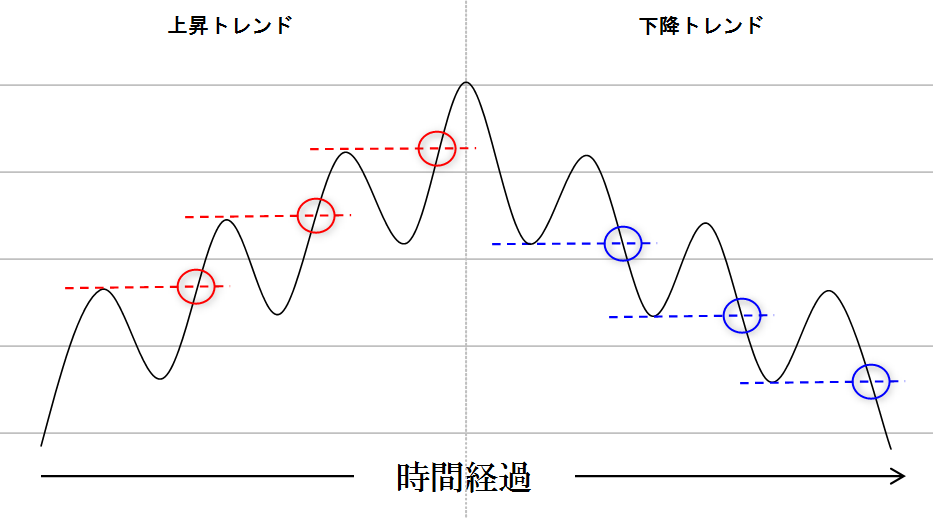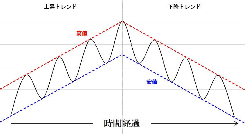 要するに、上昇トレンドは株価が上昇するにつれて高値と安値がどんどん高くなっていき、下降トレンドは株価が下落するにつれて高値と安値がどんどん安くなっていく状態です。