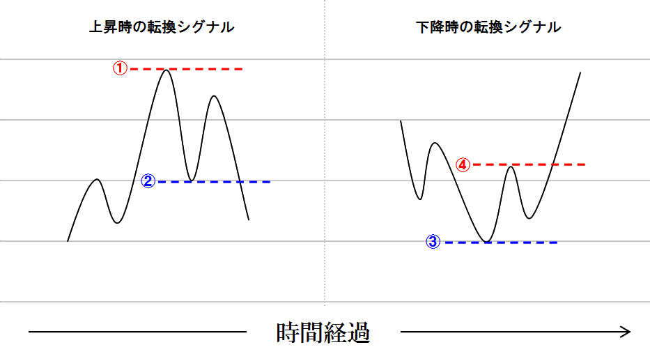 ・上昇から下降への転換シグナルは「高値の切り上げに失敗し安値を切り下げた場合」