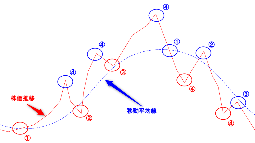ですので、グランビルの法則を覚える場合、最初に提示したイメージ画像の流れではなく、各売買パターンを覚えておくと良いでしょう。