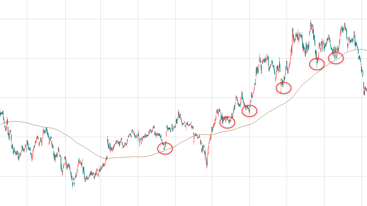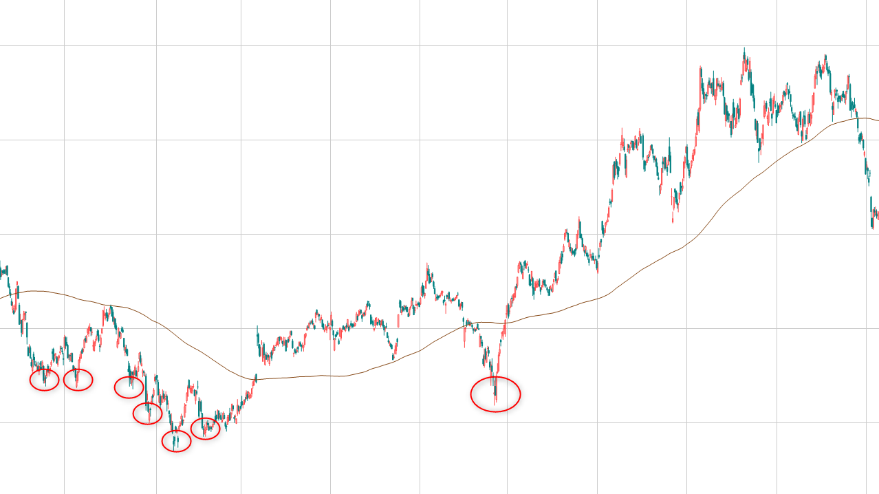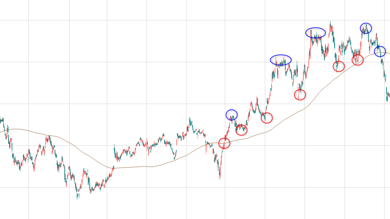 上記は簡単なイメージ画像となりますが、グランビルの法則ではトレンド転換での売買ポイントや、押し目買いや戻り売りなどの売買ポイントを判断することができます。