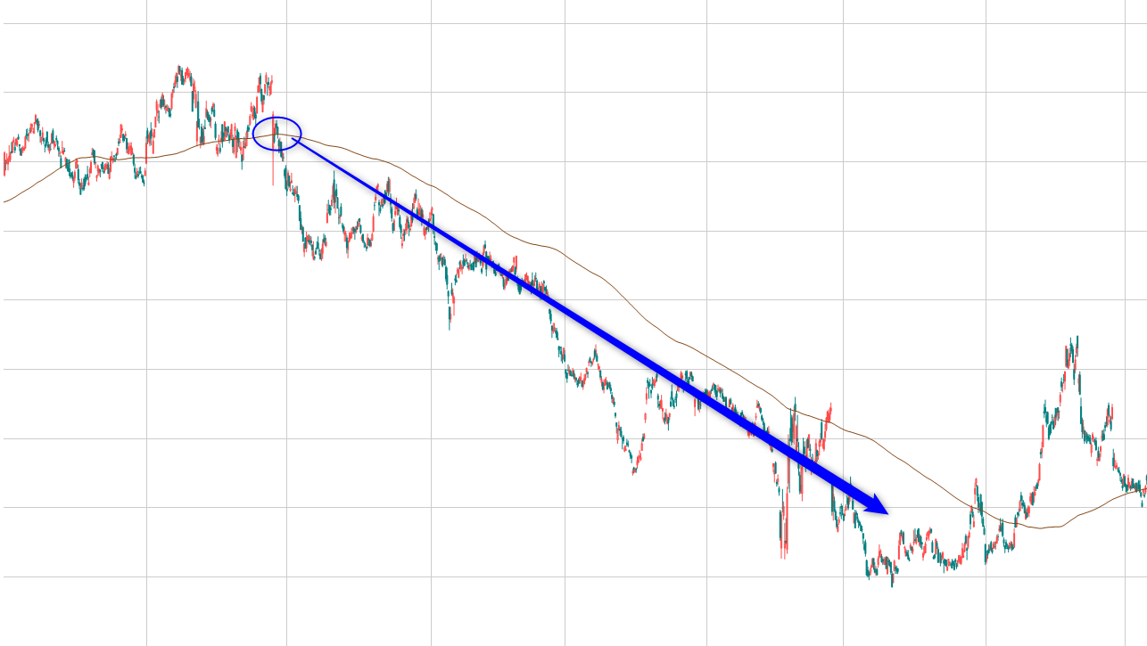株価が移動平均線を下抜けすると、移動平均線は少しずつ下向いていき、株価が天井をつけて下落する可能性が高いと判断されます。